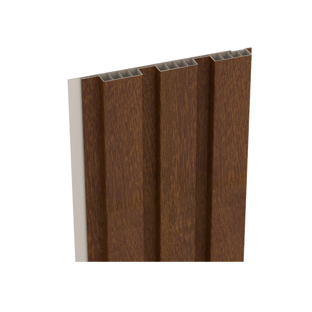 A Coleção Crossout, na sofisticada cor Walnut, oferece o charme clássico da madeira em tom castanho-escuro, perfeito para projetos externos que buscam elegância e aconchego. Produzido em PVC 100% virgem, este revestimento em barras reproduz com realismo a textura e o aspecto da madeira natural, mas sem a necessidade de manutenção constante, pintura ou envernizamento.