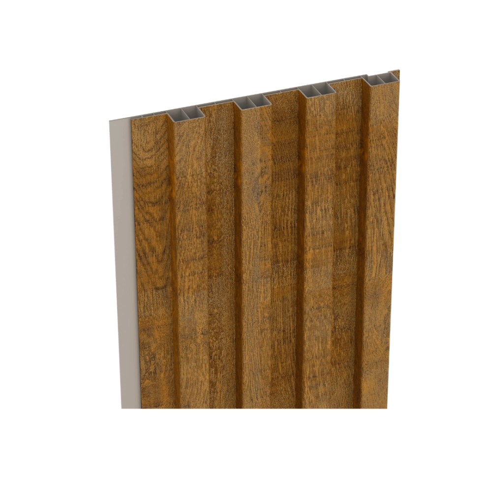 A Coleção Crossout Shield, na elegante cor Redwood, traz o charme da madeira avermelhada em ripas mais estreitas, oferecendo um acabamento externo moderno e detalhado. Produzido em PVC 100% virgem, este revestimento em barras combina resistência, durabilidade e praticidade, reproduzindo fielmente a textura e o tom da madeira natural sem exigir manutenção constante.