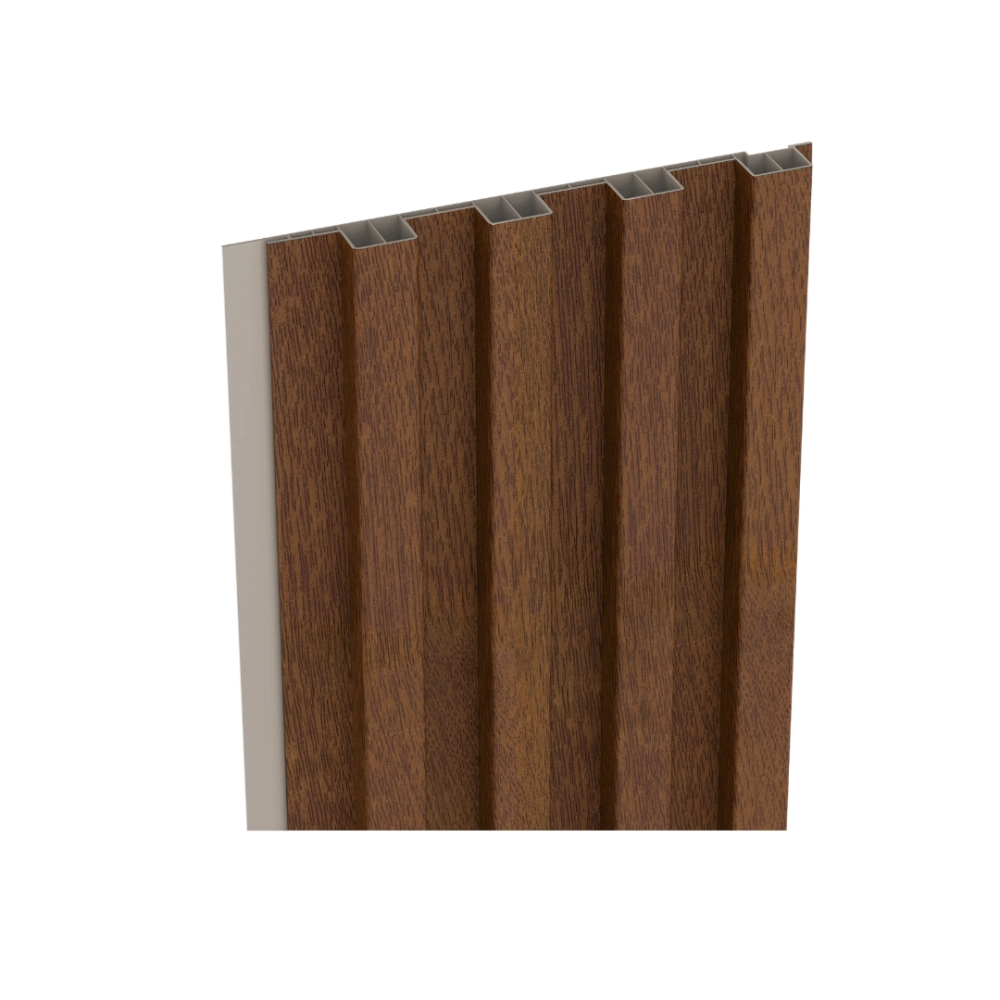 A Coleção Crossout Shield, na sofisticada cor Walnut, oferece ripas mais estreitas em tom castanho-escuro, proporcionando um acabamento externo moderno, elegante e detalhado. Produzido em PVC 100% virgem, este revestimento em barras combina durabilidade, resistência e praticidade, reproduzindo fielmente a textura da madeira natural sem exigir manutenção constante.