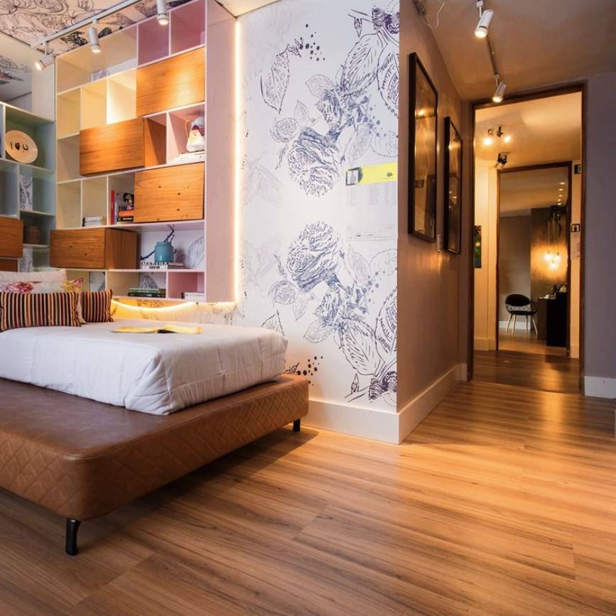 Para um acabamento perfeito, é recomendada a instalação utilizando a manta acrílica Eucatex e incluir rodapés e perfis de porta, que complementam o visual e protegem as bordas, dando ao ambiente um toque final elegante e funcional, para seu piso laminado Max Elegance da Eucafloor.