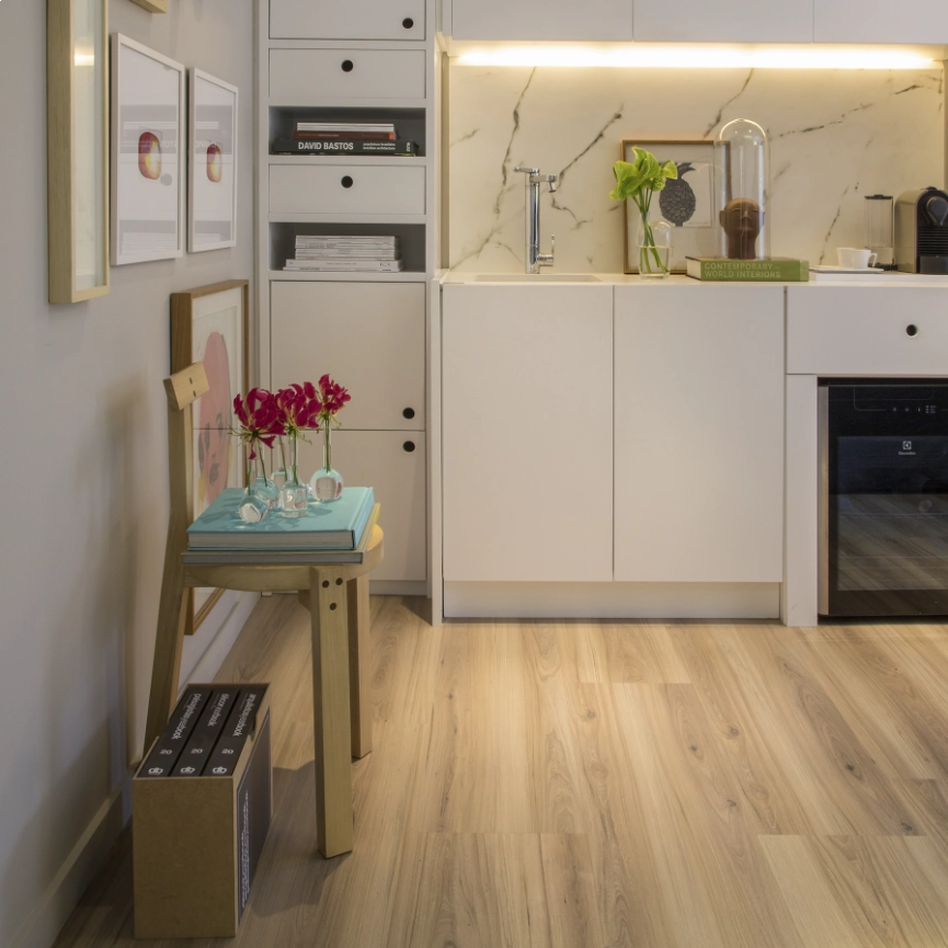 O piso eucafloor Elmo Macciato combina nuances escuras e elegantes, lembrando o tom profundo do café espresso. Esse piso é perfeito para quem busca uma base impactante e cheia de estilo, ideal para ambientes modernos que valorizam o contraste com móveis e elementos de decoração claros.