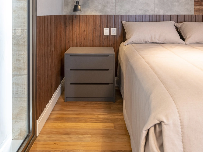 Produzido em poliestireno reciclado, é resistente e sustentável, não absorvendo umidade e sendo imune a cupins e fungos. Seu acabamento hot stamp no tom Ipê Escuro proporciona uma aparência sofisticada, remetendo ao aconchego da madeira natural com um toque de modernidade.